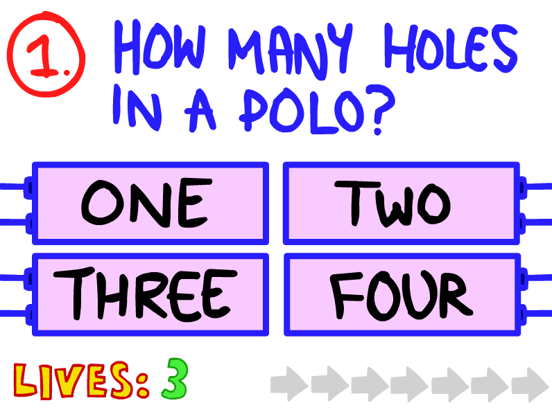 Almost Impossible Trivia Question 10 Of Men Don T Know This About Their Partners What Is It Kpat from dehayf5mhw1h7.cloudfront.net You're given only three lives, and you'll lose one with every mistake you make. The impossible quiz is an online trivia quiz that features only very hard questions. The average guy says he has five of these?a: Tourism became the main source of income in rabun county, georgia, where the movie was made. The record for this is 124 feet. Out of the four answers, only one answer is right. A recent poll found that 37% of us will take part in at least one of these events at christmas this year? There are in total 110 questions.